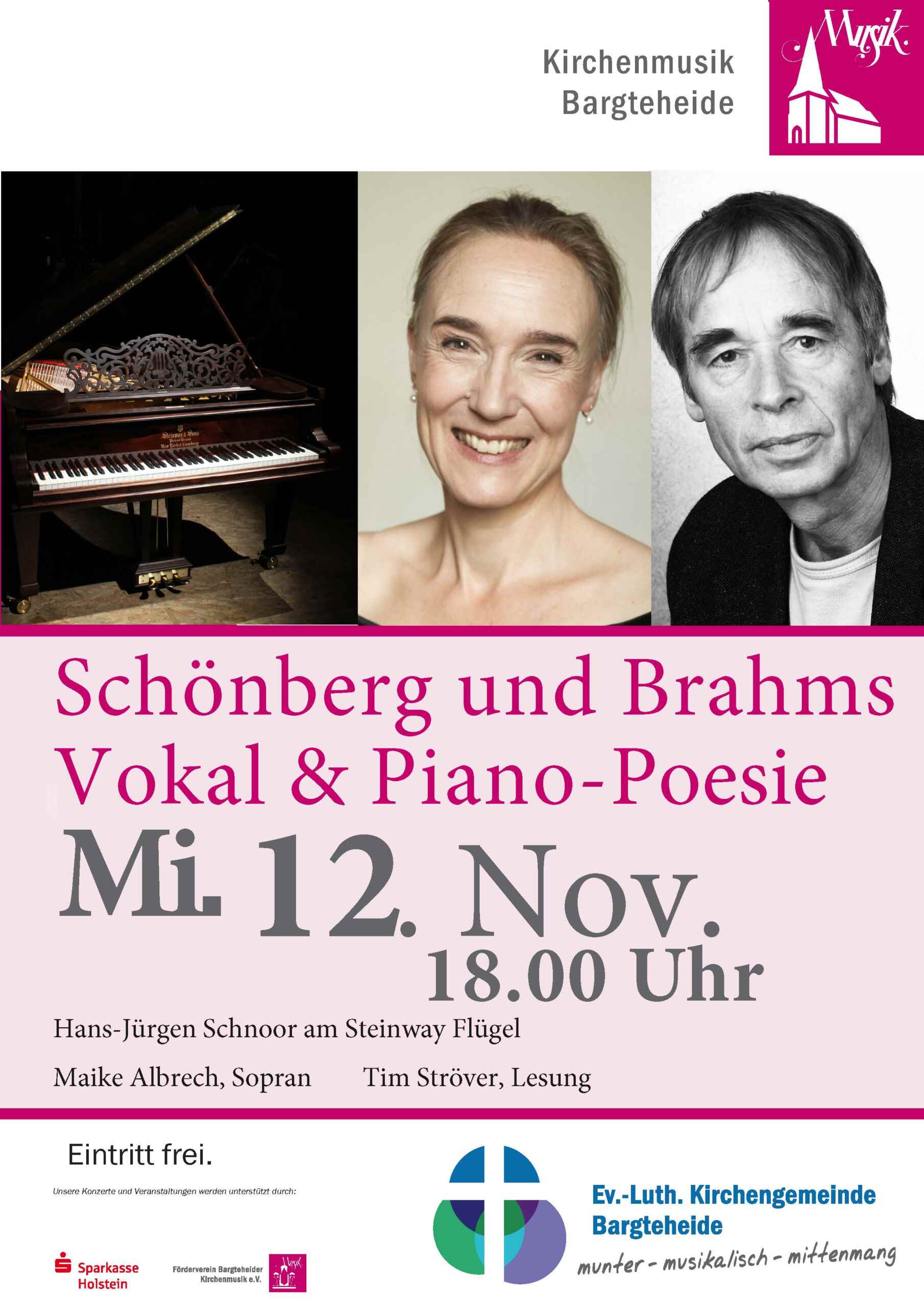 Hans-Jürgen Schnoor am Steinway-Flügel und Maike Albrecht / Sopran präsentieren “Das Buch der hängenden Gärten“ von Arnold Schönberg sowie ausgewählte Lieder von Johannes Brahms. Vertonte Gedichte aus Antike, Mittelalter und Orient werden von Pastor Tim Ströver mit passenden Texten und Erläuterungen ergänzt. Der Flügel, ein Instrument aus Schönbergs Zeit, verleiht dem Abend besonderen Charme.
