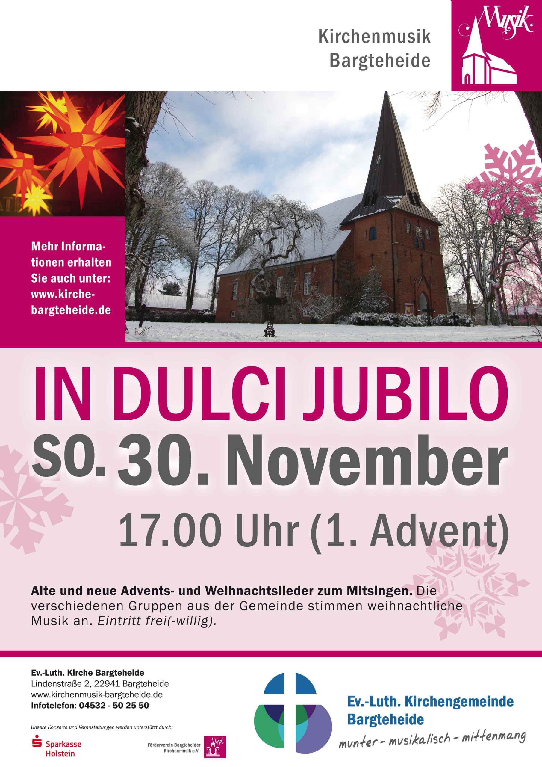 Die Kirchengemeinde Bargteheide ein zum traditionellen Adventskonzert „In dulci jubilo“ in der Ev. Kirche, Lindenstraße 2. Die Musikgruppen der Kirchengemeinde musizieren schöne alte und neue Advents- und Weihnachtslieder. Dabei ist das Publikum sowohl zum Zuhören als auch zum Mitsingen eingeladen