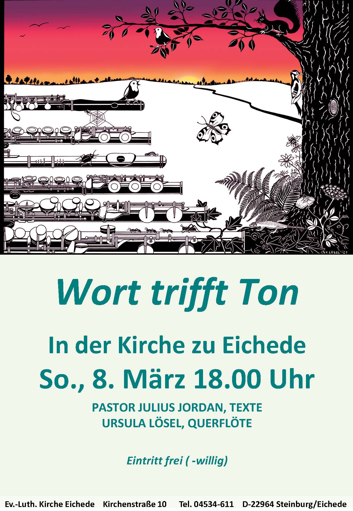 Wort trifft Ton“ in der Eichedeer Kirche Ein musikalisch-literarischer Abend mit Pastor Julius Jordan und Flötistin Ursula Lösel In der Eichedeer Kirche wird die beliebte Reihe „Wort trifft Ton“ fortgesetzt: Pastor Julius Jordan und die Flötistin sowie Grafikerin Ursula Lösel laden zu einem besonderen Abend ein, an dem sich Literatur, Musik und bildende Kunst auf eindrucksvolle Weise verbinden. Am Sonntag, 8. März 2026, um 18 Uhr erwartet die Besucherinnen und Besucher eine stimmungsvolle Kombination aus einfühlsam vorgetragenen Texten und den warmen, facettenreichen Klängen verschiedener Flöten. Neben ausgewählten musikalischen Werken werden auch eigene Kompositionen von Ursula Lösel erklingen, die den Abend persönlich und kreativ prägen. Ein besonderer künstlerischer Akzent entsteht durch Lösels eigene Grafiken rund um Musikinstrumente. In einer fantasievollen visuellen Reise werden ihre Werke ausgestellt und projiziert. So verschmelzen Klang, Wort und Bild zu einem atmosphärischen Gesamterlebnis, das zum Innehalten, Nachdenken und Genießen einlädt. Die Veranstaltung lädt dazu ein, für eine Weile den Alltag hinter sich zu lassen und in eine Welt aus Musik, Klangfarben und Poesie einzutauchen. Wann: Sonntag, 8. März 2026, 18:00 Uhr Wo: Lindenallee 2, 22964 Steinburg Herzliche Einladung an alle Interessierten – wir freuen uns auf Ihr Kommen!